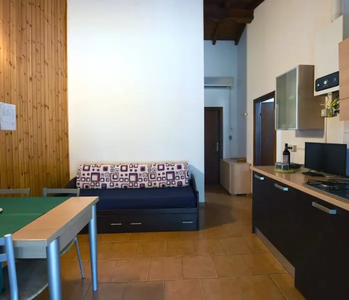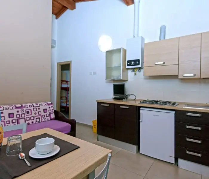 Room with double bed, room with bunk bed. Bathroom with wc, shower, wash basin and bidet. SAT TV. Living room with kitchenette furnished with stove, refrigerator and kitchenwares.