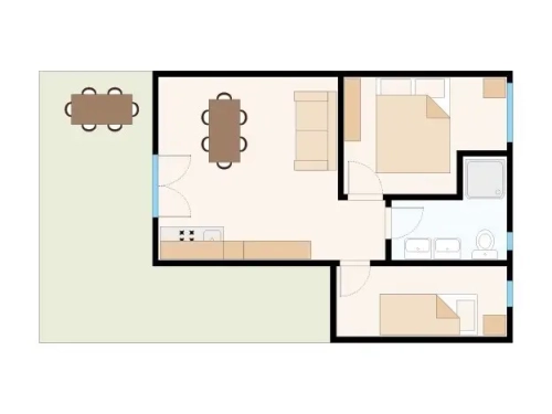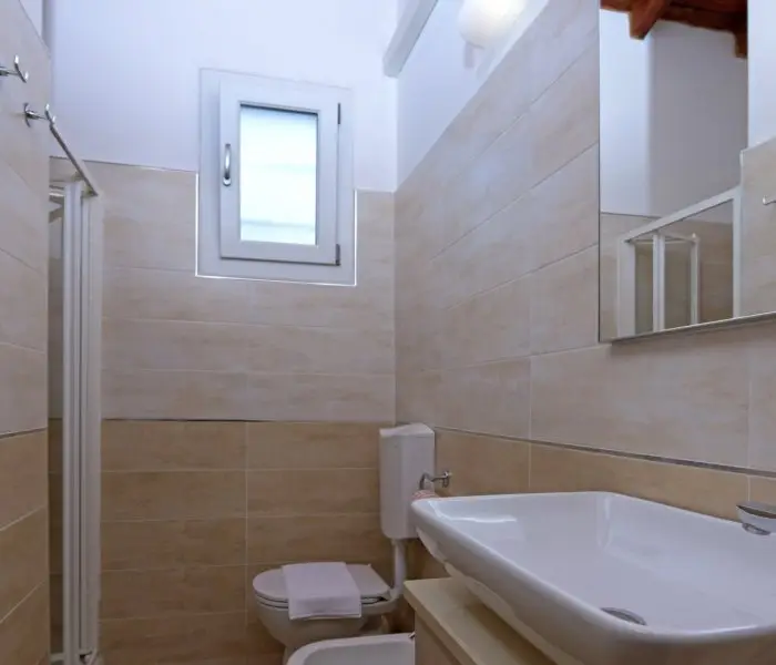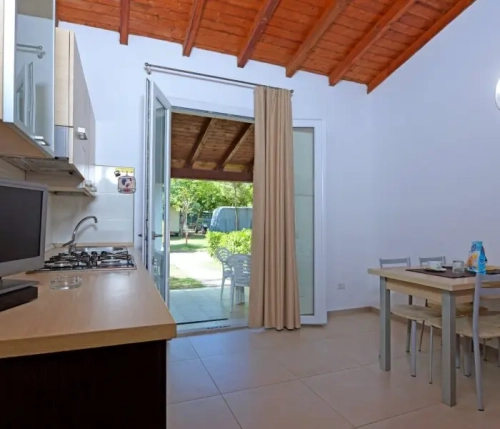 Comfortable semi-detached houses on the ground floor, suitable for families. Located in the centre of the village at 150 mt from the beach and close to the services. Outside veranda (8 sqm) furnished with table and chairs.