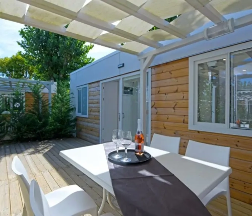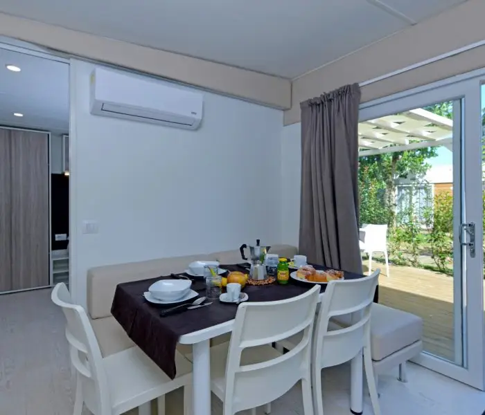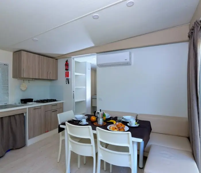 4 persons, first and last cleaning, 1 umbrella and 2 sunbeds at the beach with the same number of the mobilhome, electricity, water, gas, air conditioning, blankets, sheets and bath towels (weekly changed), car parking, animation, SAT TV.